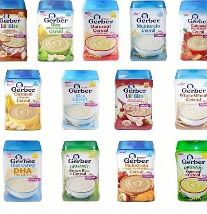 – Nhóm bột ăn dặm Gerber cho bé trên 4 tháng gồm các vị: đào và táo, yến mạch, chuối và dâu tây; yến mạch và chuối; yến mạch; táo quế; táo và khoai tây; ngũ cốc; ngũ cốc và lúa mì vị gạo; gạo, chuối và táo.