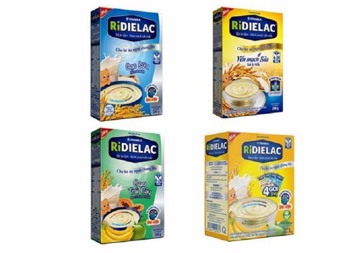 – Bột ăn dặm Ridielac Vinamilk dành cho trẻ từ 6-24 tháng bao gồm 4 loại: vị yến mạch và sữa; vị 4 gói 3 vị ngọt, vị gạo và trái cây, vị gạo sữa.