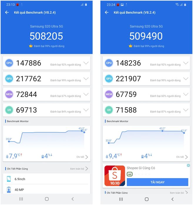 Điểm Antutu trên Galaxy S20 Ultra đạt gần 510 ngàn điểm, xếp vào hàng top với điểm cao nhất hiện nay. So với Note10 Exynos 9825 năm trước đo được khoảng 430 điểm, S20 có hiệu suất cao hơn gần 20%. Điều này cho thấy cấu hình của máy rất mạnh mẽ và đáp ứng tốt mọi nhu cầu của người dùng.