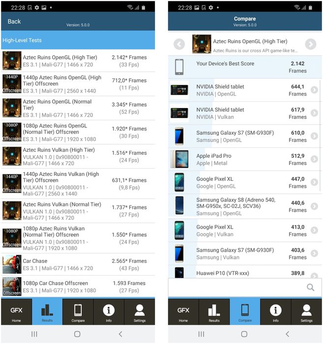 GPU Mali-G77 trên Galaxy S20 Ultra đã cho kết quả ấn tượng trong bài test này. Với GFXBench, máy đã vượt xa ~1600 khung hình so với Note10 sử dụng Mali-G76.