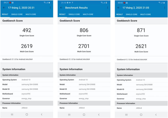 Bài test này tập trung vào đánh giá hiệu suất xử lý CPU. Mặc dù có sự không ổn định trong điểm số, nhưng sau khi chơi game và thực hiện lại bài test, điểm số đã ổn định hơn. Điểm đơn nhân gần 900 và điểm đa nhân gần 2700 cho thấy vi xử lý này khá mạnh mẽ. So với Exynos trên Note10, điểm số tăng khoảng 20%, cho thấy sự cải thiện đáng kể.