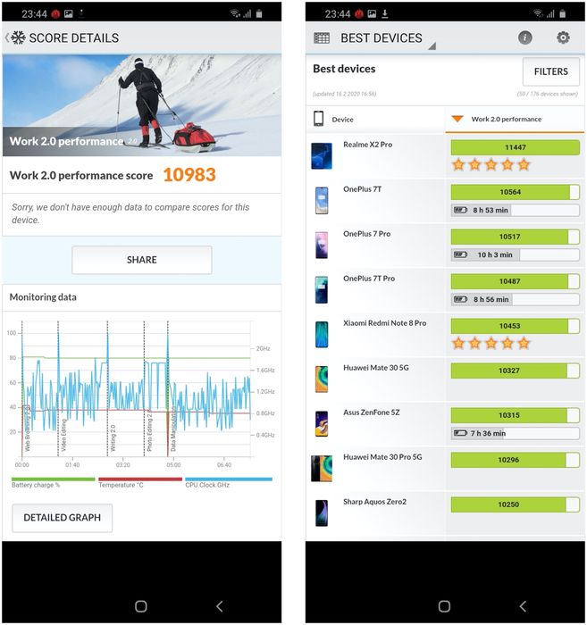 Gần 11 ngàn điểm trên PCMark thật sự ấn tượng với Galaxy S20 Ultra. So với flagship Note10 năm trước, con số này tăng lên từ hơn 8000 lên gần 11000. Điểm PCMark phản ánh trải nghiệm hàng ngày thông qua mô phỏng các tác vụ như duyệt web, chỉnh sửa hình ảnh, biên tập video và xem dữ liệu. Với vị trí cao trong bảng xếp hạng, S20 Ultra chỉ đứng sau Realme X2 Pro và vượt trội hơn so với OnePlus hay Mate 30 5G.