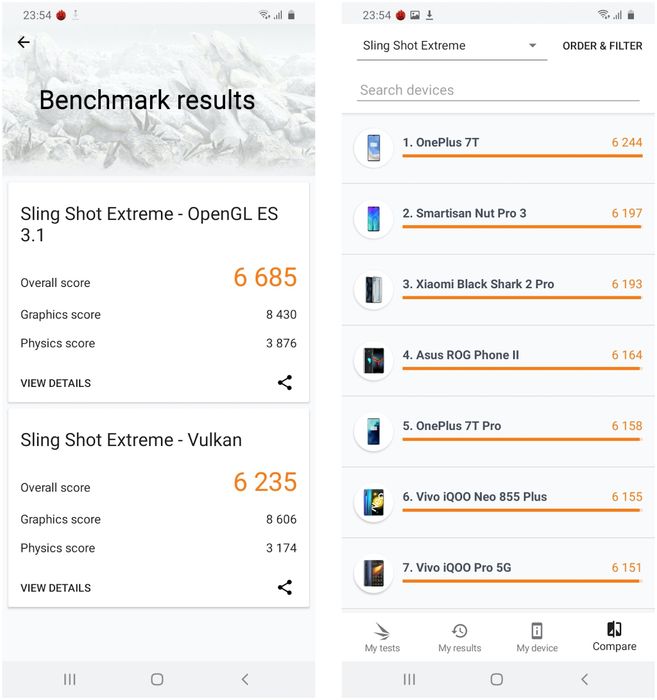 Năm nay, Galaxy S20 thực sự làm tôi hài lòng hơn với hiệu suất 'tròn vai' so với Note10 năm trước. Điểm số 3DMark của S20 vô cùng ấn tượng với hơn 6600 điểm cho bài test Sling Shot Extreme sử dụng thư viện OpenGL ES 3.1. Điểm số cao này đảm bảo bạn có thể chơi mọi game hoặc thực hiện các tác vụ đồ họa mượt mà, tương tự như điểm số GFX bench đã được đề cập trước đó.
