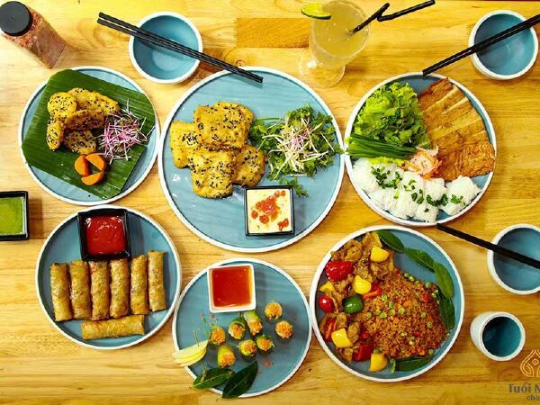 Tuổi Ngọc Chay mang đến trải nghiệm ẩm thực với những món quen thuộc như cuốn, gỏi, salad, và các đặc sản Việt Nam. Bạn có thể thưởng thức lẩu cháo, lẩu chua cay, lẩu riêu để đổi mới khẩu vị. Đặc biệt, những món riêng như chuối đậu, bún bung, Nấm kho tộ, xào xả ớt, Nem rong biển, nem trái cây đều hấp dẫn và lành mạnh. Tuổi Ngọc Chay chú trọng từng bước, từ việc chọn lựa nguyên liệu hữu cơ đến cách chế biến linh hoạt và sáng tạo. Mỗi bữa ăn được bày biện đẹp mắt, tinh tế, là sự kết hợp hài hòa của nguyên liệu tốt nhất.
