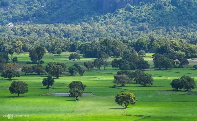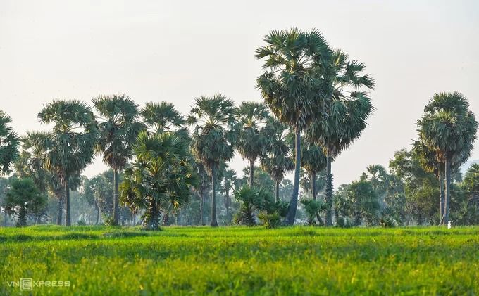 Tháng Mười, cánh đồng mênh mông chuyển mình với bức tranh màu mạ mới, hòa quyện với sắc xanh của hồ Tà Pạ và những đám thốt nốt.