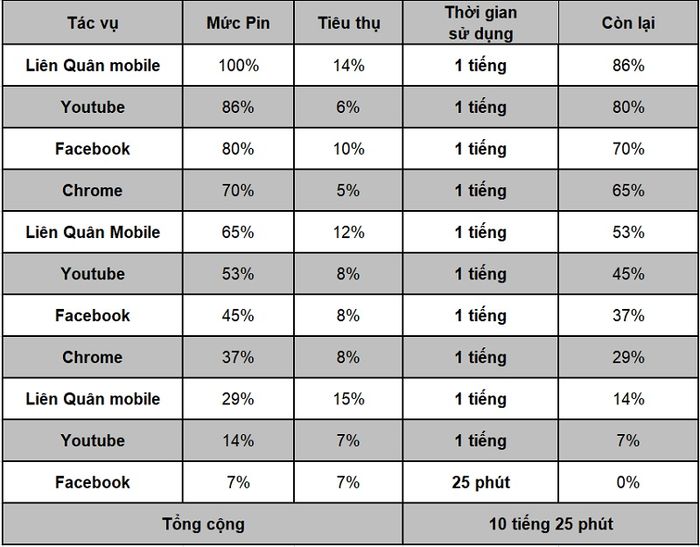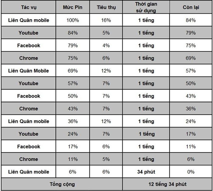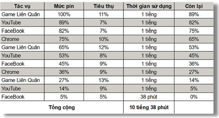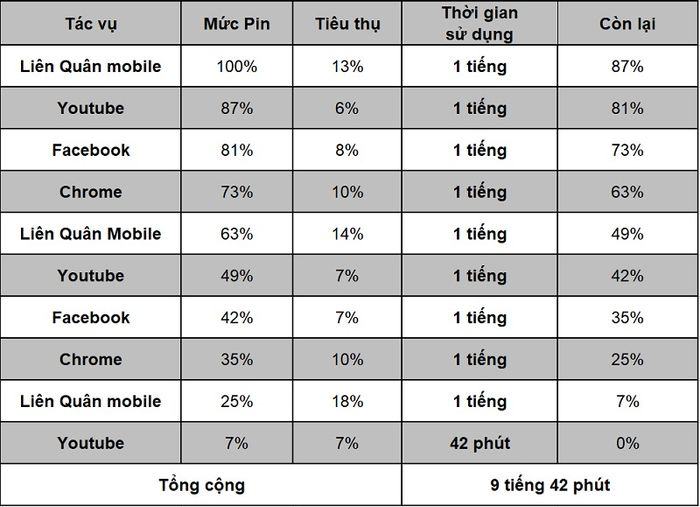 Thời lượng pin trên Realme 8 khi sử dụng các tác vụ liên tục.Realme 8 được trang bị viên pin 5.000 mAh, cho thời gian sử dụng liên tục hơn 12 tiếng. Nếu sử dụng chỉ cho các tác vụ nhẹ nhàng như ghi chú, chụp ảnh, giải trí, thì thời gian sử dụng còn lâu hơn nữa.