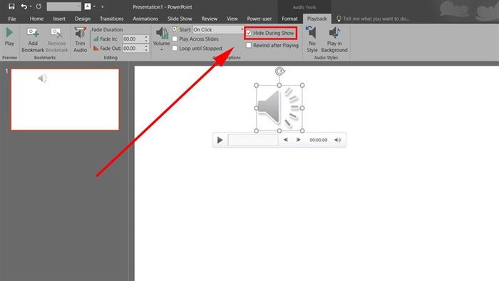Bước 2: Tiếp theo, chọn biểu tượng loa, chuyển sang tab Phát lại và đánh dấu vào ô Ẩn trong khi trình chiếu. Như vậy, khi trình diễn, biểu tượng loa sẽ biến mất giúp tăng tính thẩm mỹ cho bài thuyết trình.
