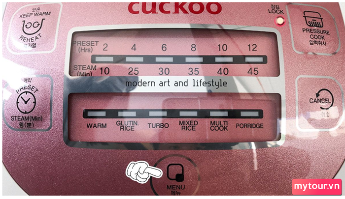 - Nút Menu: Dành cho các món như Sushi Rice, Gaba Rice, Soft Glutin, Porridge, Multi Cook, Fermen Bread, v.v…
