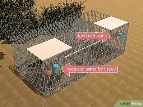 Đặt con chim giả sống vào bẫy larsen, nếu bạn đang sử dụng. Có một ngăn riêng biệt cho con chim giả để nó không thể trốn thoát khi chân dùng để thiết lập. Đặt con chim giả vào ngăn này, đảm bảo nó có thể đạt đến thức ăn và nước của mình, trước khi đóng nó lại.