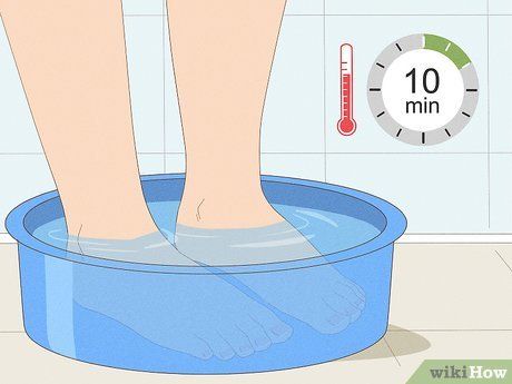 Ngâm móng chân trong nước ấm khoảng 10 phút. Đổ nước ấm vào một bồn hoặc tô lớn và ngâm chân vào để chúng ngâm đều. Sự nhiệt và độ ẩm sẽ giúp làm mềm móng chân của bạn để chúng ít gãy hơn khi bạn cắt chúng. Sau khoảng 10 phút, lau khô móng chân để bạn có thể bắt đầu cắt chúng.