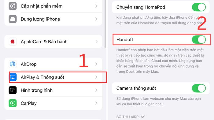 Bước 2: Chọn mục AirPlay & Hỗ trợ liên tục > Kích hoạt tính năng Handoff bằng cách gạt nút sang phải.