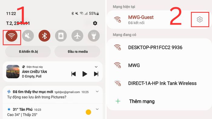 Giữ biểu tượng Wifi trong 3 giây để mở mạng kết nối > Chọn biểu tượng bánh răng cưa