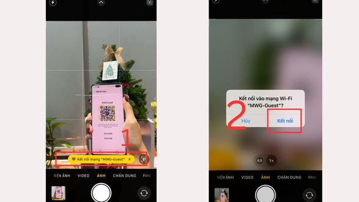 Bước 3: Cầm điện thoại cần kết nối, mở Máy ảnh > và quét mã QR để thiết lập kết nối mạng
