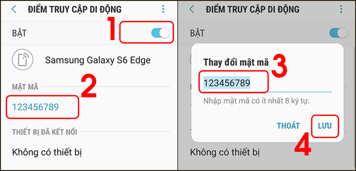Bước 3: Bật điểm truy cập di động > Nhấn vào Mật mã để thay đổi mật khẩu > Cài đặt mật khẩu mới phù hợp > Nhấn Lưu để xác nhận lưu mật khẩu.