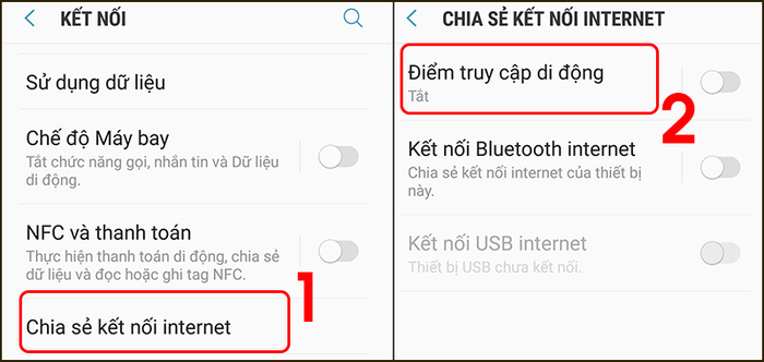 Bước 2: Chọn Chia sẻ kết nối Internet > Bấm vào Điểm truy cập di động để bật tính năng này.