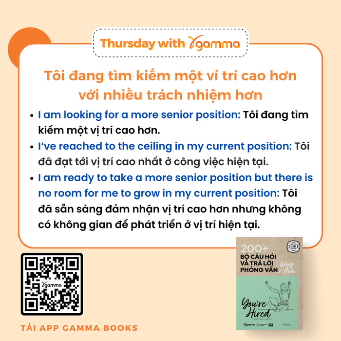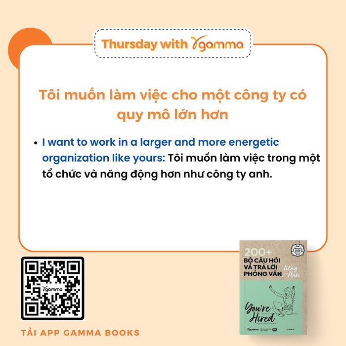 Tìm hiểu thêm về cách phỏng vấn bằng tiếng Anh trong cuốn sách 200+ Bộ câu hỏi và câu trả lời phỏng vấn tiếng Anh được GAMMA xuất bản.