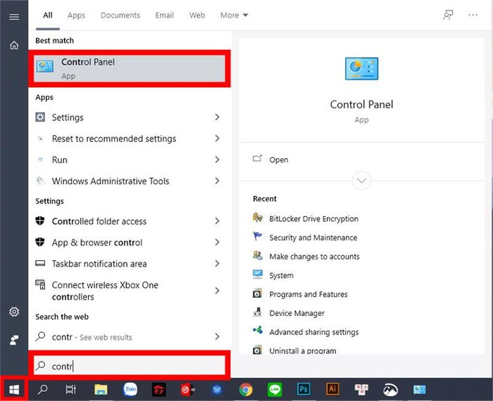 Bước 1: Click vào menu Start (biểu tượng cửa sổ) > gõ Control Panel > chọn Control Panel.