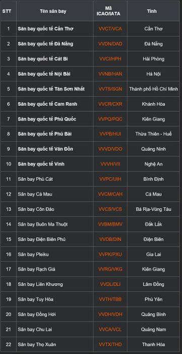 Ga đi quốc tế ở sân bay Vân Đồn (Quảng Ninh)Danh sách mã hãng hàng không nội địa tại Việt Nam:
