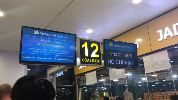 Chuyến bay VN277 của Vietnam Airlines khởi hành lúc 19:30 đi TP HCM, đang gọi khách ở 26 hàng ghế phía trước lên máy bay theo cửa số 12. Sau khi khách có vé ngồi ở 26 hàng ghế này lên xong thì sẽ gọi tiếp hàng 27 trở đi.