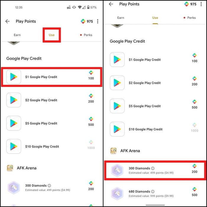 Bước 3: Chọn Use. Chọn Google Play Credit để sử dụng.