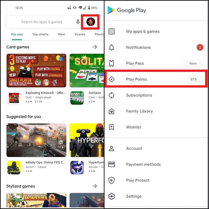 Bước 2: Tiếp theo, thực hiện các bước để sử dụng điểm thưởng. Nhấn vào biểu tượng Avatar ở góc phải màn hình. Sau đó, chọn Play Points.