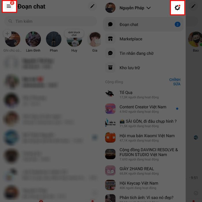 Bước 1: Bắt đầu bằng cách mở ứng dụng Messenger trên điện thoại. Ở góc trên bên trái màn hình, bạn sẽ thấy một biểu tượng menu 3 gạch, hãy nhấn vào đó. Sau đó, chọn cài đặt ở góc trên bên phải.