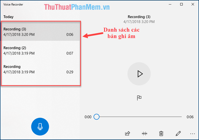 Bước 4: Sau khi ghi âm xong, bạn sẽ được đưa đến giao diện quản lý các bản ghi âm. Tại đây, bạn có thể nghe lại, chia sẻ, xóa, đổi tên, hoặc cắt ngắn các bản ghi.
