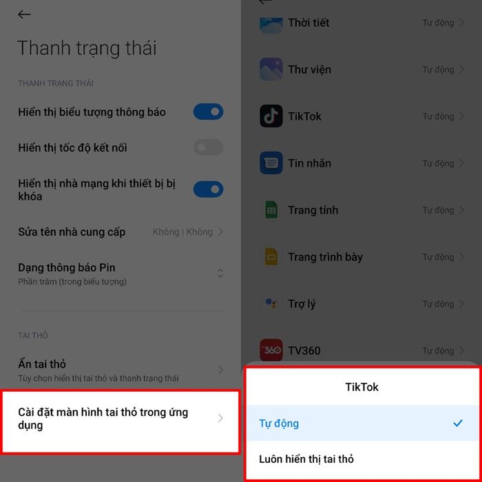 Bước 2: Chọn Cài đặt màn hình tai thỏ trong ứng dụng, sau đó chọn ứng dụng cần chỉnh. Chọn chế độ tai thỏ là Tự động hoặc Luôn hiển thị tai thỏ.