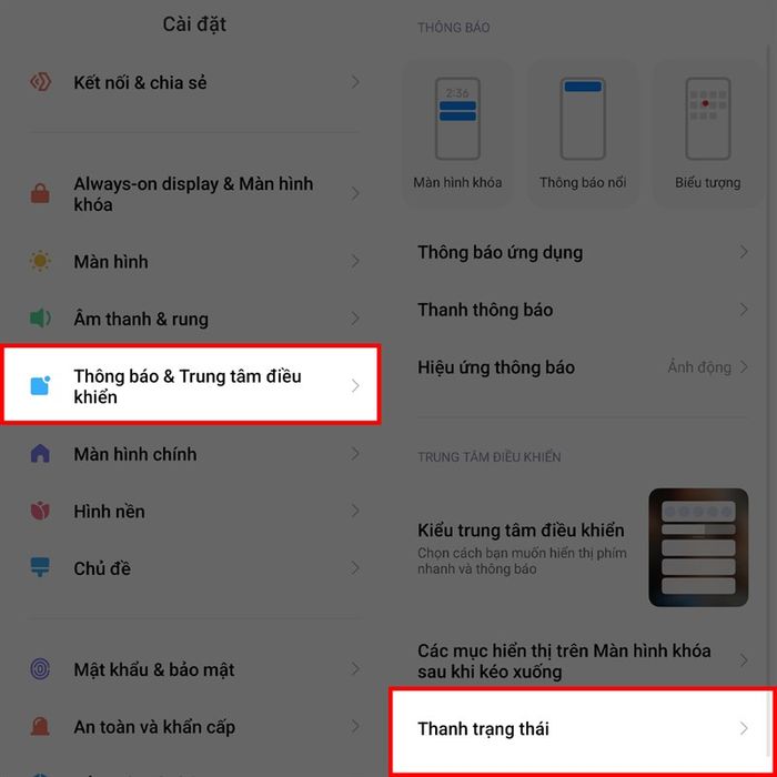 Bước 1: Truy cập vào Cài đặt trên điện thoại, sau đó chọn Thông báo & Trung tâm điều khiển. Kéo xuống và chọn Thanh trạng thái.