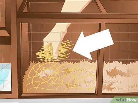 Thêm rơm. Khi đến việc giữ thỏ ấm, rơm là một trong những vật liệu tốt nhất. Đặt rơm khắp lồng. Ép rơm về phía mép lồng, thêm cách nhiệt, và đặt một ít rơm trong khu vực ngủ của thỏ. Đảm bảo thay rơm mỗi vài ngày. Thỏ có thể tiểu vào rơm và bạn không muốn thỏ của bạn ngủ trong vật liệu ẩm.