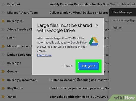 - Nếu bạn không thấy thông báo về việc tệp đính kèm của bạn quá lớn, điều này có nghĩa là tệp đó dưới 25MB và sẽ được đính kèm vào tin nhắn của bạn một cách bình thường.