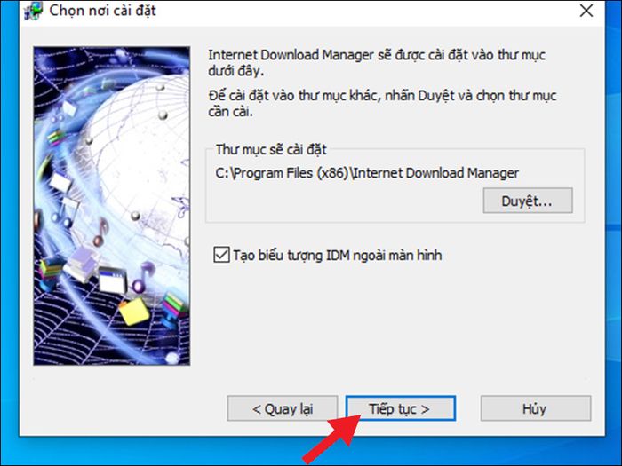 Tiếp theo, hãy lựa chọn thư mục để cài đặt phần mềm, bằng cách nhấn vào Duyệt > Tiếp tục.