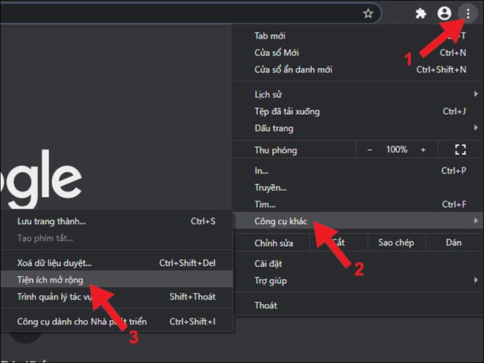 Hoặc bạn có thể bấm vào biểu tượng 3 dấu chấm > Chọn Công cụ khác > Chọn Tiện ích mở rộng.