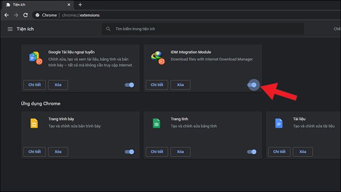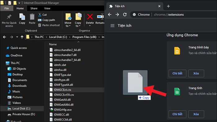 Truy cập thư mục gốc của IDM (thường là C:\Program Files\Internet Download Manager), tìm thấy file IDMGCExt.crx, sau đó kéo và thả file vào trang tiện ích của Chrome.