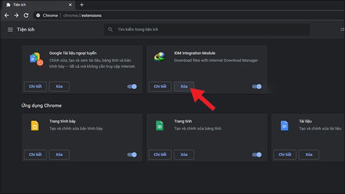 Mở giao diện tiện ích mở rộng trên Chrome, bạn nhấn vào nút Xóa của IDM để loại bỏ tiện ích cũ.