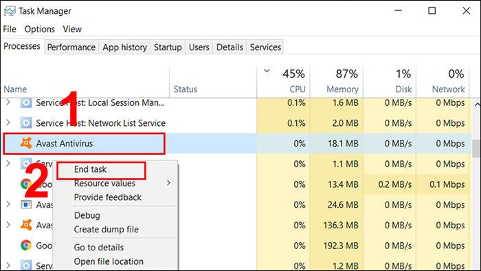 Bước 2: Trong cửa sổ mới, tìm đến các ứng dụng diệt virus đang chạy trên máy > Click chuột phải vào ứng dụng đó > Chọn Kết thúc ứng dụng.