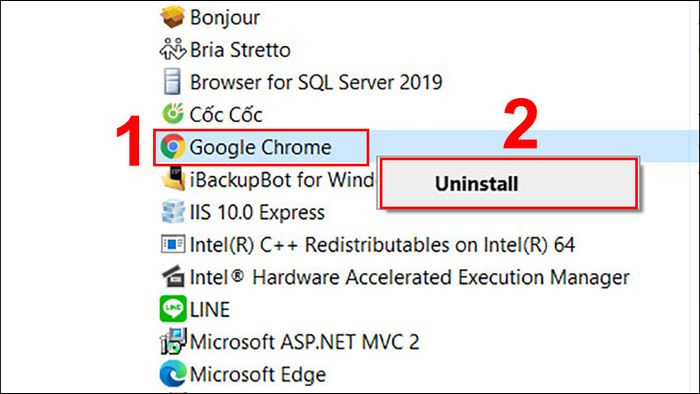 - Bước 2: Chuột phải vào ứng dụng Google Chrome > Chọn Uninstall để gỡ cài đặt > Một cửa sổ xuất hiện, nhấn Yes.