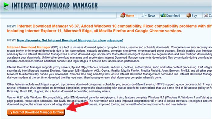 Truy cập trang chính thức của IDM và nhấn nút Thử IDM miễn phí để tải về máy tính.