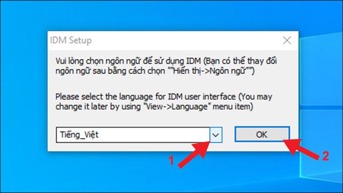 Nhấn vào nút mũi tên để chọn ngôn ngữ ưa thích > Bấm OK để tiếp tục.
