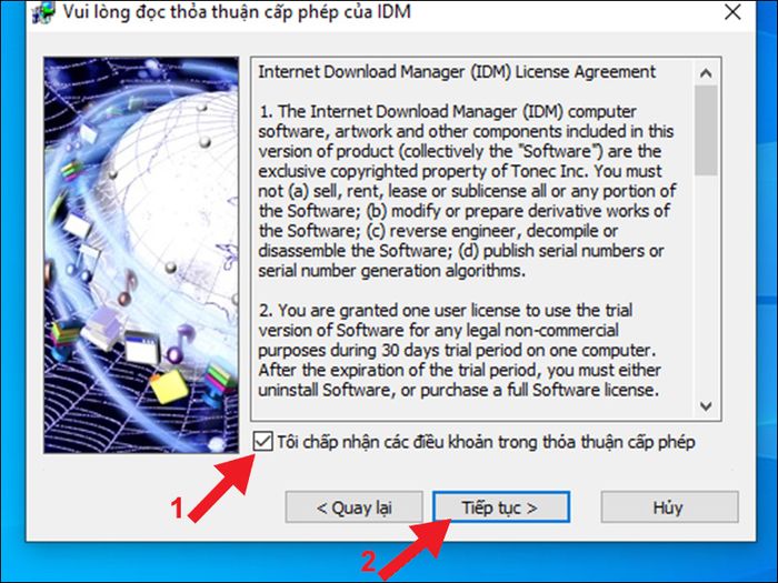 Đánh dấu vào ô Tôi đồng ý với các điều khoản trong thỏa thuận cấp phép > Bấm Tiếp tục.