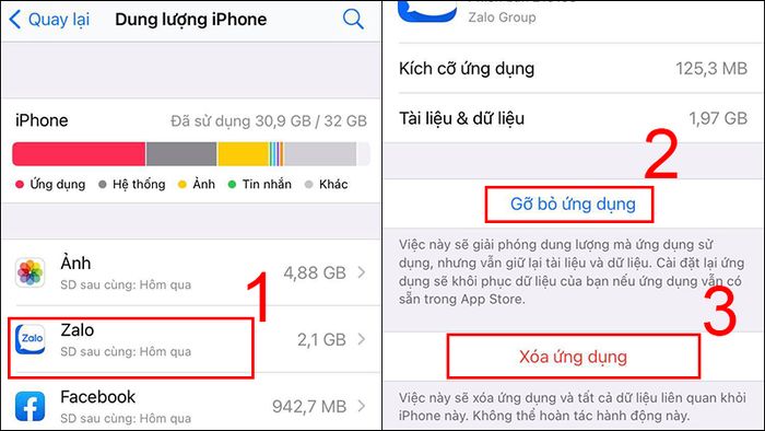 Bước 3: Chọn Zalo > Chọn Gỡ bỏ ứng dụng và Xóa ứng dụng để xóa cache.
