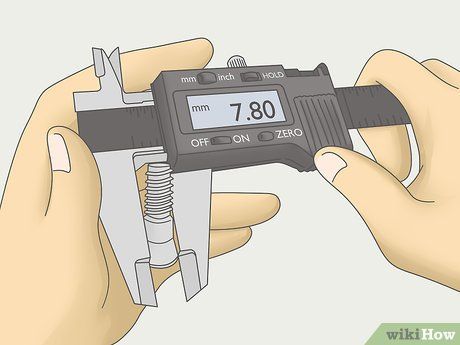Đo đường kính của trục ốc bằng calipers. Hãy đảm bảo rằng ốc bạn đang sử dụng có đầu phẳng với đáy hình nón, nếu không, nó sẽ không dễ dàng được khoan lỗ trước. Mở càng của calipers đủ rộng để bạn có thể đặt ốc giữa chúng. Làm chặt càng quanh trục chính của ốc, nhưng không làm chặt ở phần vặn, đó là phần nâng cao quanh ốc. Đọc đo trên cạnh của calipers để biết đường kính của trục ốc.