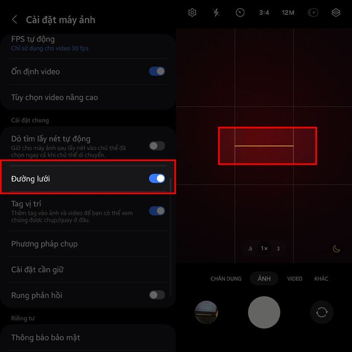 Bước 2: Trong cài đặt camera, kéo xuống và chọn Cài đặt chung, sau đó bật chế độ lưới. Quay lại giao diện chính của camera để kiểm tra với thanh màu vàng giữa màn hình, biểu thị ảnh có nghiêng hay không.