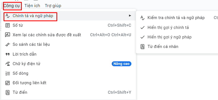 Bước 1: Mở Google Tài liệu và chọn file cần kiểm tra chính tả. Sau đó, nhấn vào mục “Công cụ” và chọn “Chính tả và ngữ pháp” từ danh sách thả xuống.