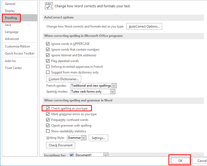 Bước 3: Chọn mục Proofing và đánh dấu vào phần Check spelling as you type trong mục Khi sửa lỗi chính tả và ngữ pháp trong Word. Sau đó nhấn nút OK để hoàn tất.