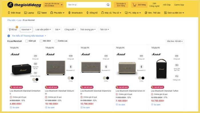 Mytour, Điện máy XANH và TopZone là những cửa hàng ủy quyền bán các sản phẩm loa Marshall chính hãng với nhiều ưu đãi và khuyến mãi hấp dẫn. Một số sản phẩm phổ biến bao gồm Marshall Emberton II, Marshall Woburn III, Marshall Stanmore III, Marshall Acton III, Marshall Tufton, Marshall Kilburn II, Marshall Stockwell II, Marshall Middleton, Marshall Willen.