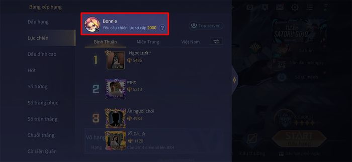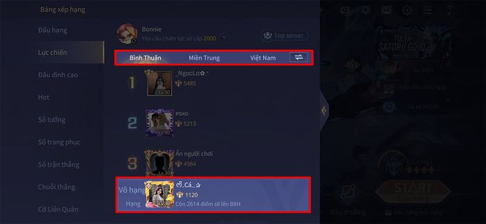 Bước 2: Tại đây, bạn sẽ thấy BXH lực chiến của những vị tướng mà bạn thường xuyên sử dụng. Điểm lực chiến của bạn sẽ hiển thị ngay cạnh biểu tượng avatar. Nếu muốn xem top khu vực Liên Quân, chỉ cần nhấn vào khu vực phía trên.