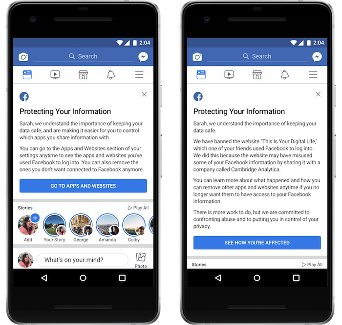 Bắt đầu từ lúc 12 giờ trưa giờ EDT vào thứ Hai, một số người dùng Facebook sẽ thấy một trong hai thông báo ở đầu dòng Thông tin của họ. Cả hai đều sử dụng tiêu đề Bảo vệ Thông Tin Của Bạn, với một tập trung vào Cambridge Analytica và cái kia cung cấp hướng dẫn chung hơn về cách kiểm soát những ứng dụng và trang web nào đang có quyền truy cập vào dữ liệu của bạn. Nếu mà nó hiện chậm, bạn cũng có thể kiểm tra trực tiếp ngay tại đây.