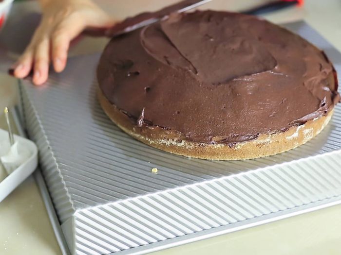 - Phết kem lên xen kẽ các mặt bánh và phủ kem trên toàn bộ các mặt xung quanh cho đến khi hoàn thành.