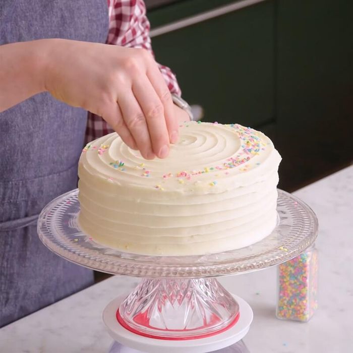 - Khi bánh bông lan nguội, nặn kem ra từ từ, sau đó phết đều kem lên mặt bánh và các cạnh xung quanh. Sử dụng dao hoặc que để dàn đều phần kem tạo thành bánh sinh nhật.